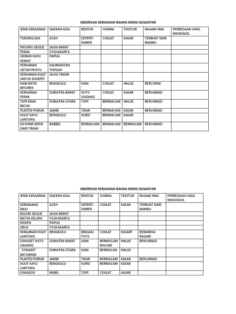Kerajinan Dari Bahan Keras. 26032019 Tabel Observasi Kerajinan Bahan Keras Nusantara Kumpulan Bahan. Secara umum kerajinan merupakan aktivitas yang melibatkan keterampilan tangan dan seni dalam menciptakan suatu produk atau barang yang memiliki fungsi atau nilai estetika yang tinggi.